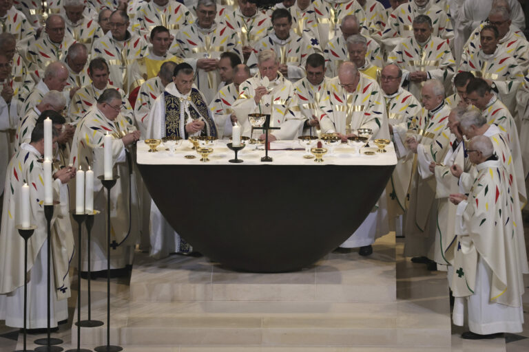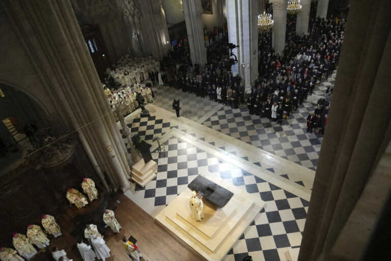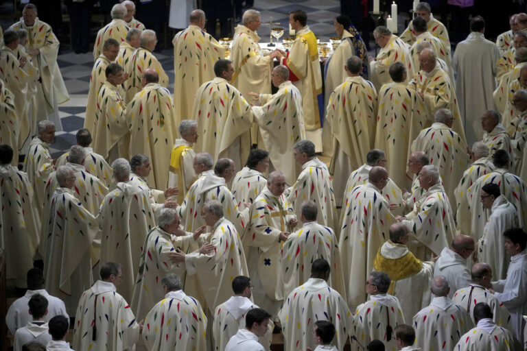 Členovia duchovenstva sa zúčastňujú inauguračnej omše v katedrále Notre Dame, kde sa koná prvá omša od katastrofálneho požiaru v roku 2019, v nedeľu 8. decembra 2024 v Paríži. Foto: SITA/AP
