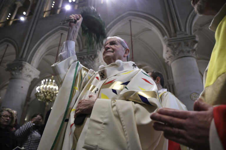 Parížsky arcibiskup Laurent Ulrich slúži inauguračnú omšu v katedrále Notre Dame, kde sa koná prvá svätá omša od katastrofálneho požiaru v roku 2019, v nedeľu 8. decembra 2024 v Paríži. Foto: Christophe Petit Tesson, Pool via AP