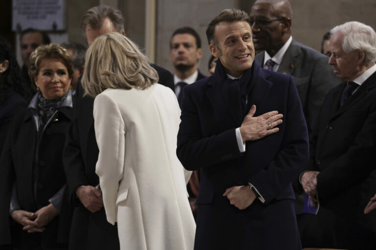 Francúzsky prezident Emmanuel Macron a jeho manželka Brigitte (v strede vľavo) sa zúčastňujú na inauguračnej omši v katedrále Notre Dame, kde sa konajú jej prvé sväté omše od katastrofálneho požiaru v roku 2019, v nedeľu 8. decembra 2024 v Paríži. Foto: Christophe Petit Tesson, Pool via AP