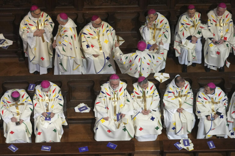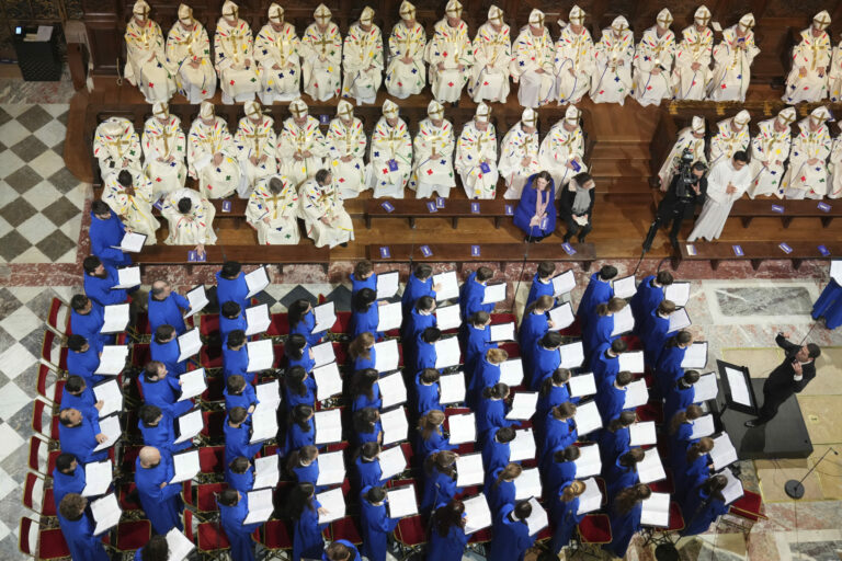 Členovia duchovenstva čakajú pred inauguračnou omšou v katedrále Notre Dame v nedeľu 8. decembra 2024 v Paríži. Foto: SITA/AP
