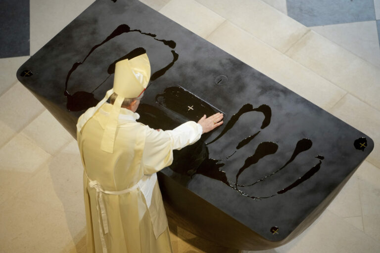 Arcibiskup Laurent Ulrich požehnáva oltár počas inauguračnej omše v katedrále Notre Dame, kde sa koná prvá omša od katastrofálneho požiaru v roku 2019, v nedeľu 8. decembra 2024 v Paríži. Foto: SITA/AP