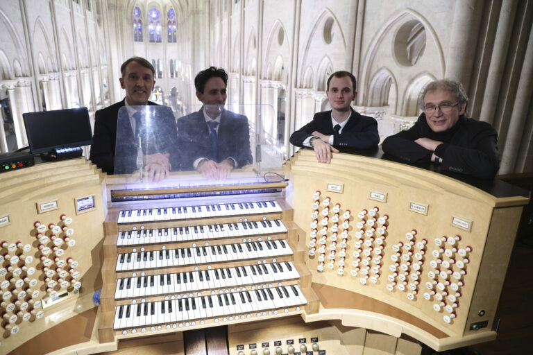 Zľava hudobníci Olivier Latry, Vincent Dubois, Thibault Fajoles a Thierry Escaich pózujú pred organom po inauguračnej omši v katedrále Notre Dame, kde hosťujú svoju prvú omšu od katastrofálneho požiaru v roku 2019, v nedeľu 8. decembra 2024 v Paríži. Foto: Christophe Petit Tesson, Pool via AP
