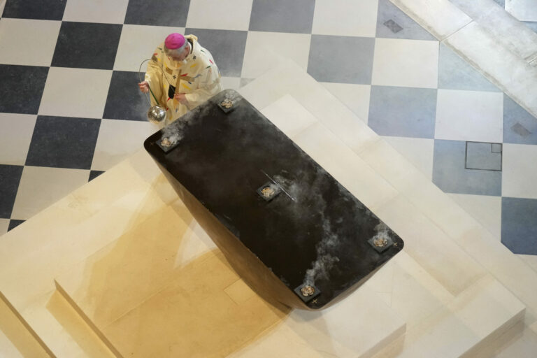 Arcibiskup Laurent Ulrich šíri kadidlo na oltári počas inauguračnej omše v katedrále Notre Dame, ktorá hostí svoju prvú omšu od katastrofálneho požiaru v roku 2019, v nedeľu 8. decembra 2024 v Paríži. Foto: SITA/AP