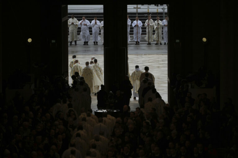 Členovia duchovenstva opúšťajú inauguračnú omšu v katedrále Notre Dame, kde sa konajú jej prvé sväté omše od katastrofálneho požiaru v roku 2019, v nedeľu 8. decembra 2024 v Paríži. Foto: SITA/AP