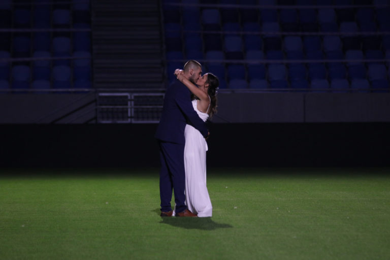 Mladomanželia Bekim a Žaneta Kjazimi počas ich svadobného tanca v rámci historicky prvej svadby na Národnom futbalovom štadióne. Bratislava, 8. august 2020. Foto: SITA/Alexandra Čunderlíková.