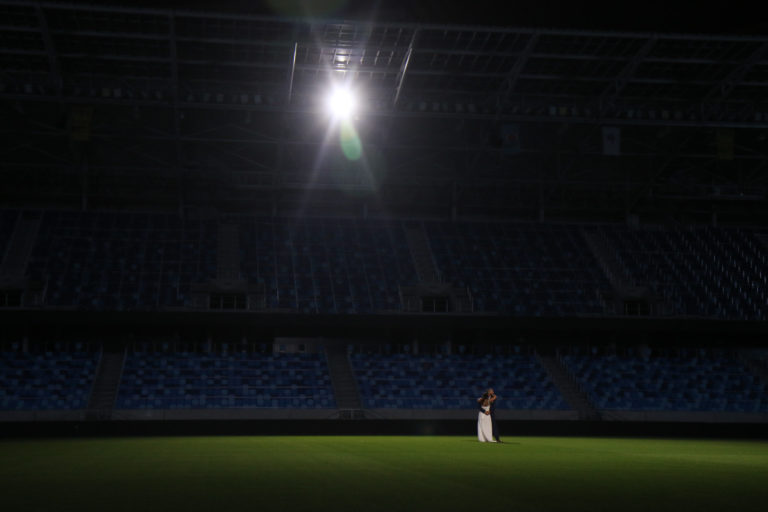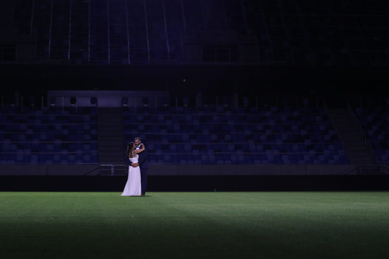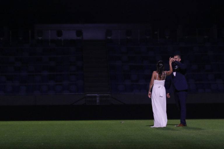 Zľava: Mladomanželia Bekim a Žaneta Kjazimi počas ich svadobného tanca v rámci historicky prvej svadby na Národnom futbalovom štadióne. Bratislava, 8. august 2020. Foto: SITA/Alexandra Čunderlíková.