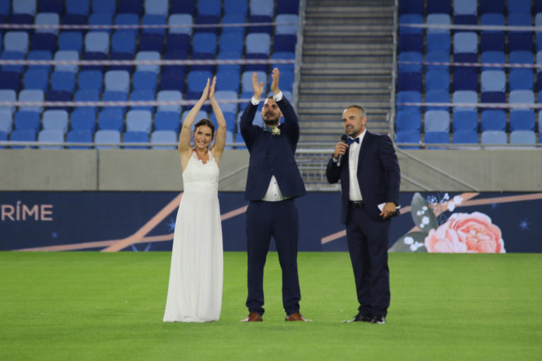 Zľava: Mladomanželia Žaneta a Bekim Kjazimi a moderátor Slavo Jurko počas historicky prvej svadby na Národnom futbalovom štadióne. Bratislava, 8. august 2020. Foto: SITA/Alexandra Čunderlíková.