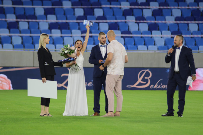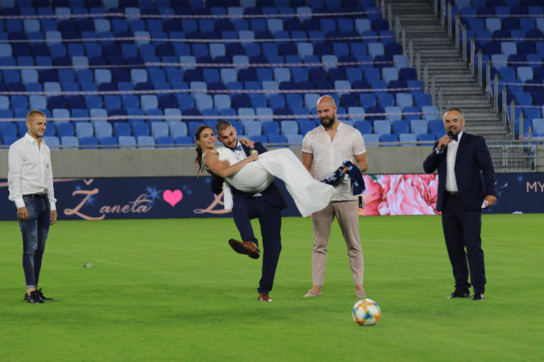 Sprava: Moderátor Slavo Jurko, generálny riaditeľ ŠK Slovan Bratislava Ivan Kmotrík ml. a mladomanželia Bekim a Žaneta Kjazimi počas odovzdávania darov v rámci historicky prvej svadby na Národnom futbalovom štadióne. Bratislava, 8. august 2020. Foto: SITA/Alexandra Čunderlíková.