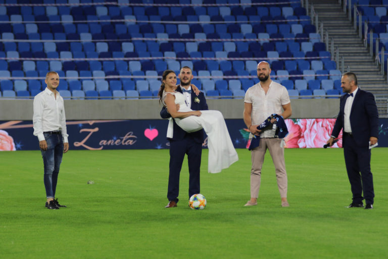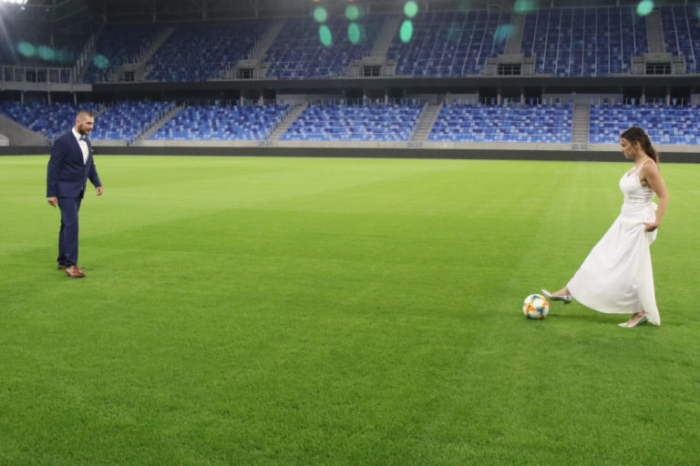 Sprava: Mladomanželia Žaneta a Bekim Kjazimi počas kopania lopty na hracej ploche v rámci historicky prvej svadby na Národnom futbalovom štadióne. Bratislava, 8. august 2020. Foto: SITA/Alexandra Čunderlíková.