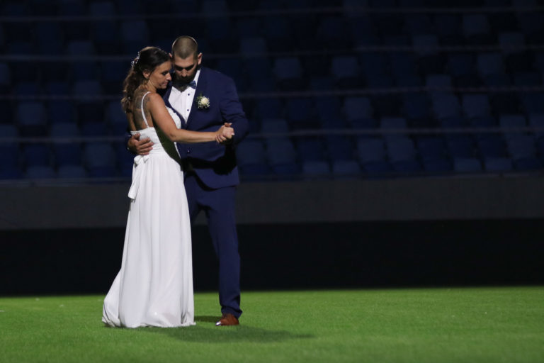 Zľava: Mladomanželia Žaneta a Bekim Kjazimi počas ich prvého svadobného tanca v rámci historicky prvej svadby na Národnom futbalovom štadióne. Bratislava, 8. august 2020. Foto: SITA/Alexandra Čunderlíková.