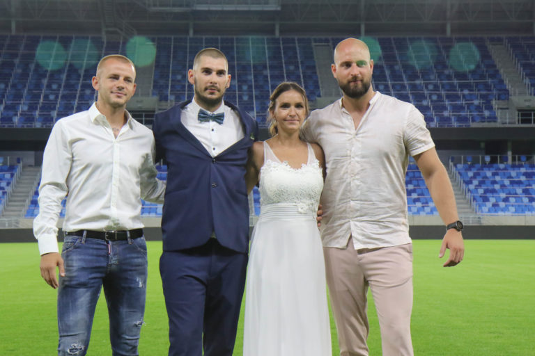 Zľava: Vladimír Weiss ml., mladomanželia Bekim a Žaneta Kjazimi a generálny riaditeľ ŠK Slovan Bratislava Ivan Kmotrík ml. počas historicky prvej svadby na Národnom futbalovom štadióne. Bratislava, 8. august 2020. Foto: SITA/Alexandra Čunderlíková.