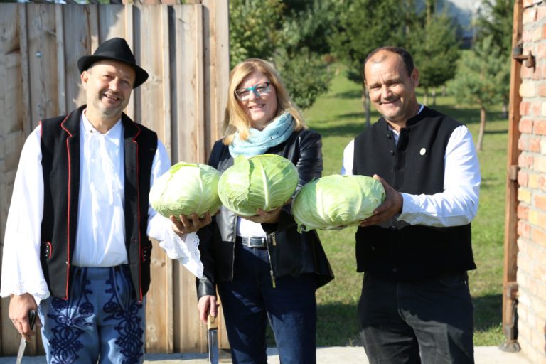 Prvé „Stupavské zelé“ nesúce Chránené označenie pôvodu (CHOP) vyrobili dnes v Stupave pri príležitosti každoročných Dní zelá. Na snímke: Ministerka pôdohospodárstva a rozvoja vidieka Gabriela Matečná (uprostred) a predseda Mástskeho potravinového spolku Jozef Fabian (vľavo) počas slávnostnej výroby kyslej kapusty. Bratislava, 30. september 2017. Foto: SITA/MPRV SR