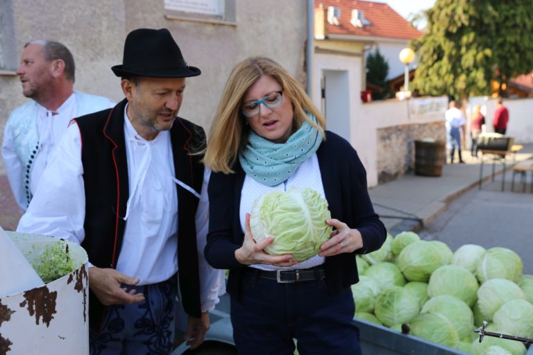 Prvé „Stupavské zelé“ nesúce Chránené označenie pôvodu (CHOP) vyrobili dnes v Stupave pri príležitosti každoročných Dní zelá. Na snímke: Ministerka pôdohospodárstva a rozvoja vidieka Gabriela Matečná (uprostred) a predseda Mástskeho potravinového spolku Jozef Fabian (vpravo) počas slávnostnej výroby kyslej kapusty. Bratislava, 30. september 2017. Foto: SITA/MPRV SR