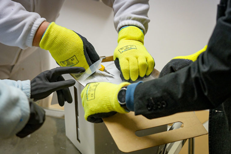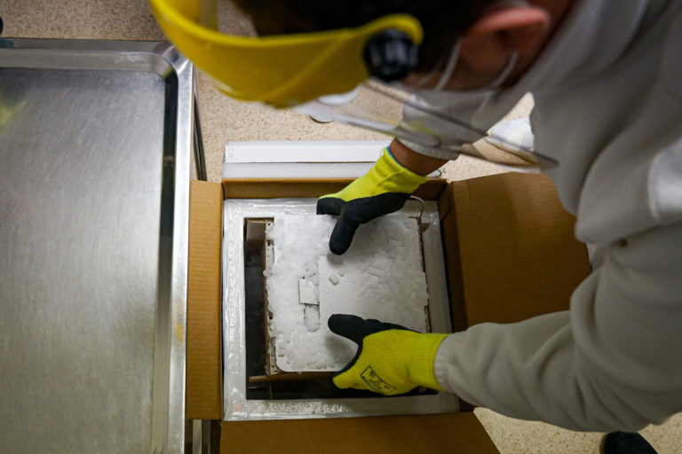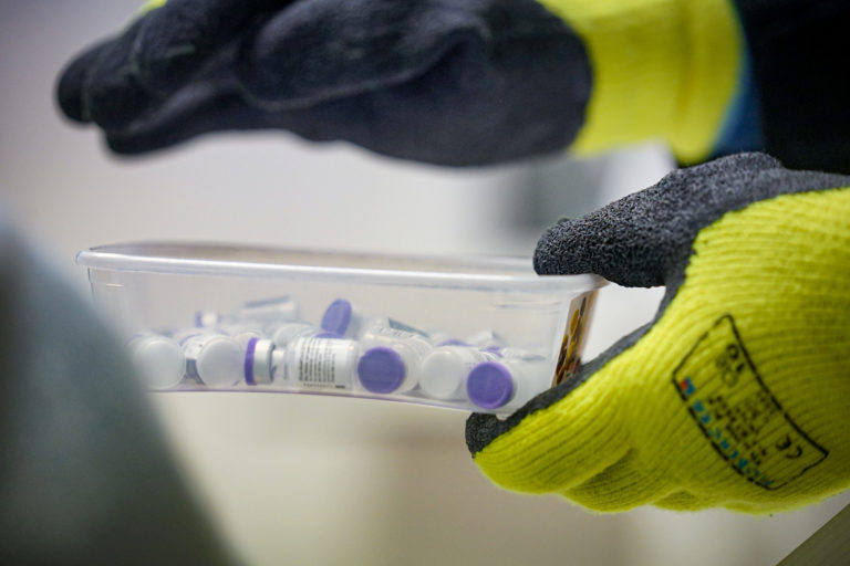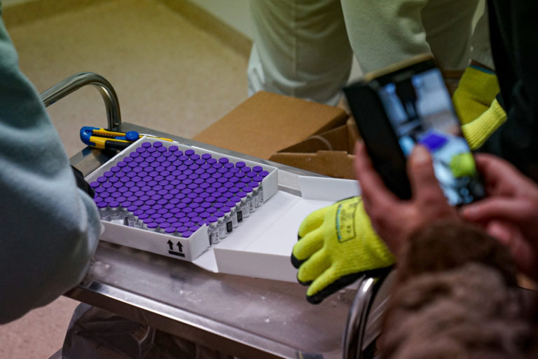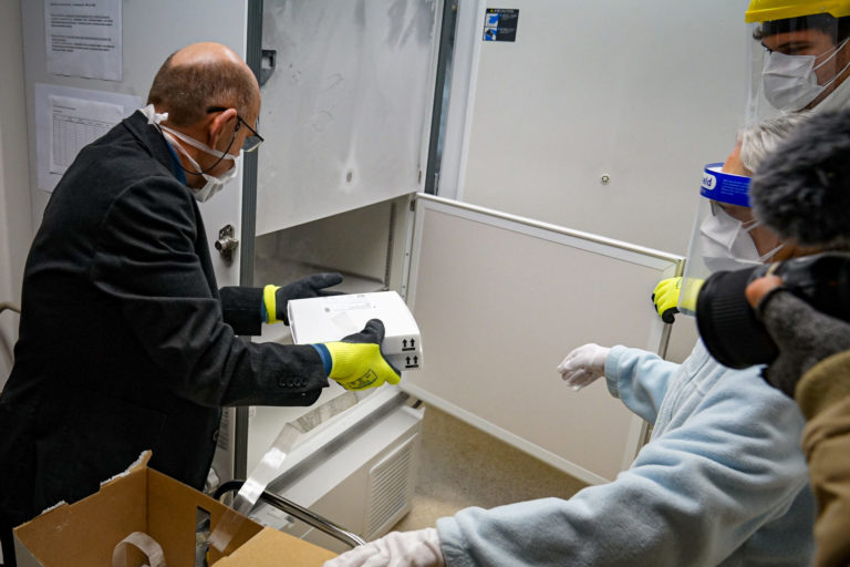 Prvé dávky vakcín na prevenciu ochorenia COVID-19, ktoré dorazili na Slovensko počas rozbaľovania a uskladnenia za prísnych teplotných a bezpečnostných podmienok vo Fakultnej nemocnici v Nitre. Bratislava, 26. december 2020. Foto: SITA/Ministerstvo zdravotníctva SR