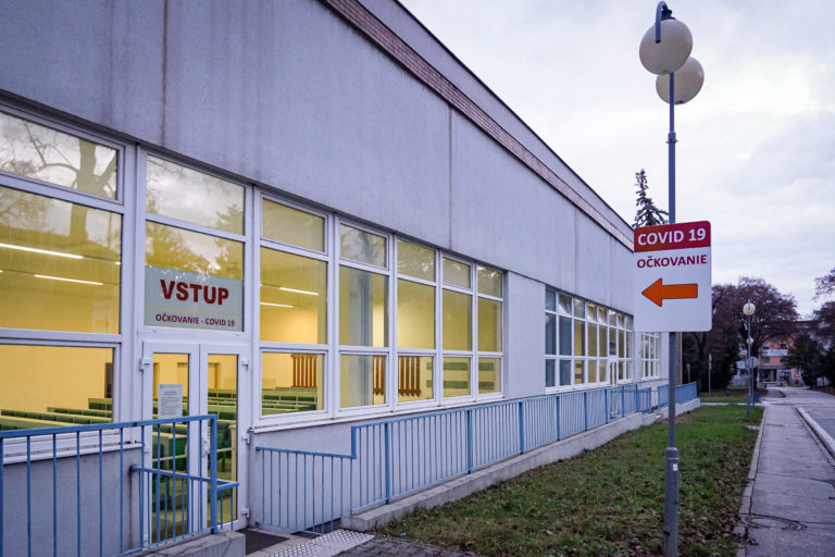Tabuľa označujúca priestor na očkovanie v areáli Fakultnej nemocnice v Nitre, kde dnes uskladnili prvé dávky vakcín na prevenciu ochorenia COVID-19. Bratislava, 26. december 2020. Foto: SITA/Ministerstvo zdravotníctva SR