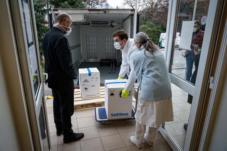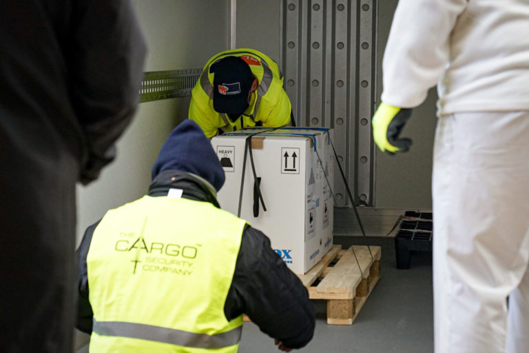 Prvé dávky vakcín na prevenciu ochorenia COVID-19, ktoré dnes dorazili na Slovensko počas vykladania z dopravného prostriedku a následného uskladnenia vo Fakultnej nemocnici v Nitre. Bratislava, 26. december 2020. Foto: SITA/Ministerstvo zdravotníctva SR