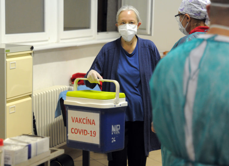 Riaditeľ Fakultnej nemocnice Nitra Milan Dubaj (vľavo) preberá prvé dávky vakcín na prevenciu ochorenia COVID-19, ktoré dnes dorazili na Slovensko z dopravného prostriedku do priestorov vo Fakultnej nemocnici v Nitre. Bratislava, 26. december 2020. Foto: SITA/Ministerstvo zdravotníctva SR