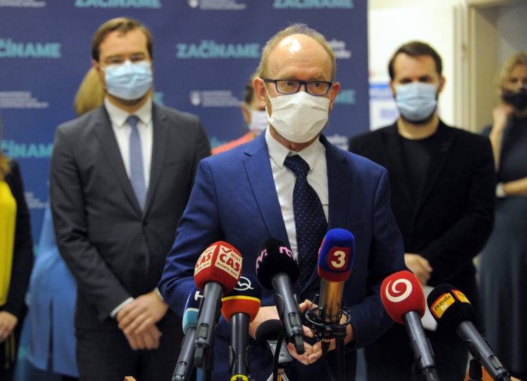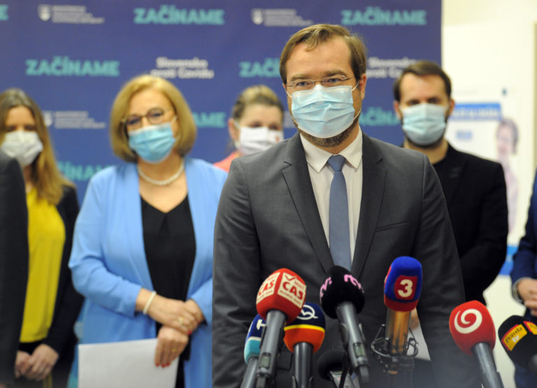 Minister zdravotníctva SR Marek Krajčí (v popredí) počas tlačovej konferencie s názvom Vianočné prekvapenie, pred začatím očkovania na Slovensku vakcínou na prevenciu ochorenia COVID-19 vo Fakultnej nemocnici (FN) v Nitre. Nitra, 26. december 2020. Foto: SITA/Martin Havran
