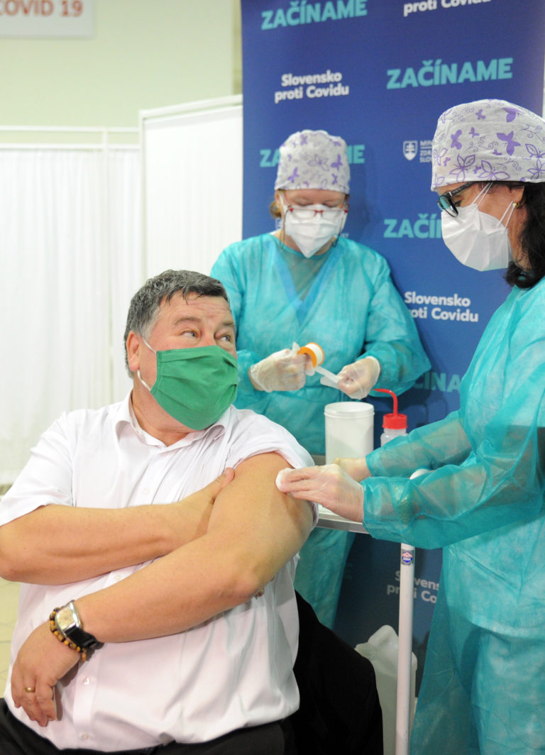 Infektológ Vladimír Krčméry (vľavo) počas začiatku očkovania na Slovensku vakcínou na prevenciu ochorenia COVID-19 vo Fakultnej nemocnici v Nitre. Nitra, 26. december 2020. Foto: SITA/Martin Havran