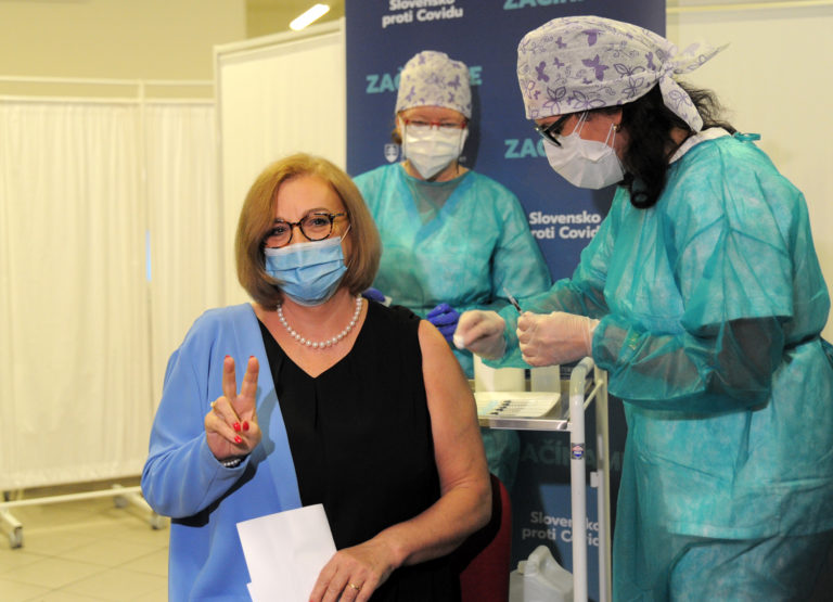 Členka konzília odborníkov Zuzana Krištúfková (vľavo) počas začiatku očkovania na Slovensku vakcínou na prevenciu ochorenia COVID-19 vo Fakultnej nemocnici v Nitre. Nitra, 26. december 2020. Foto: SITA/Martin Havran