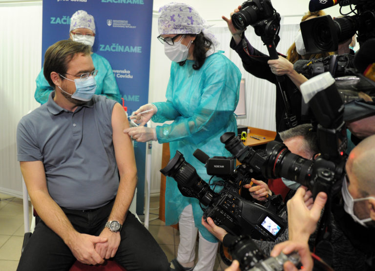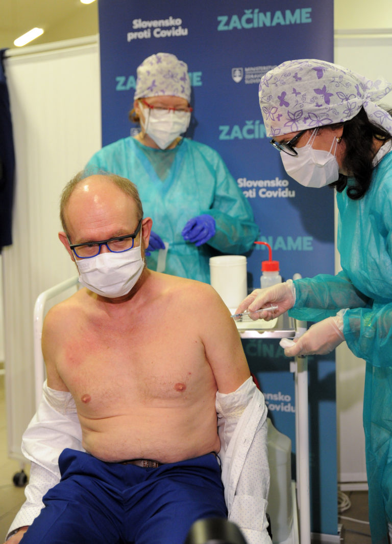 Hlavný hygienik Ján Mikas (v popredí vľavo) počas začiatku očkovania na Slovensku vakcínou na prevenciu ochorenia COVID-19 vo Fakultnej nemocnici v Nitre. Nitra, 26. december 2020. Foto: SITA/Martin Havran