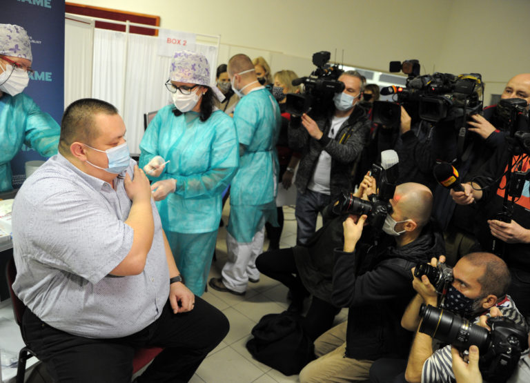 Minister zdravotníctva SR Marek Krajčí (vľavo) počas začiatku očkovania na Slovensku vakcínou na prevenciu ochorenia COVID-19 vo Fakultnej nemocnici v Nitre. Nitra, 26. december 2020. Foto: SITA/Martin Havran