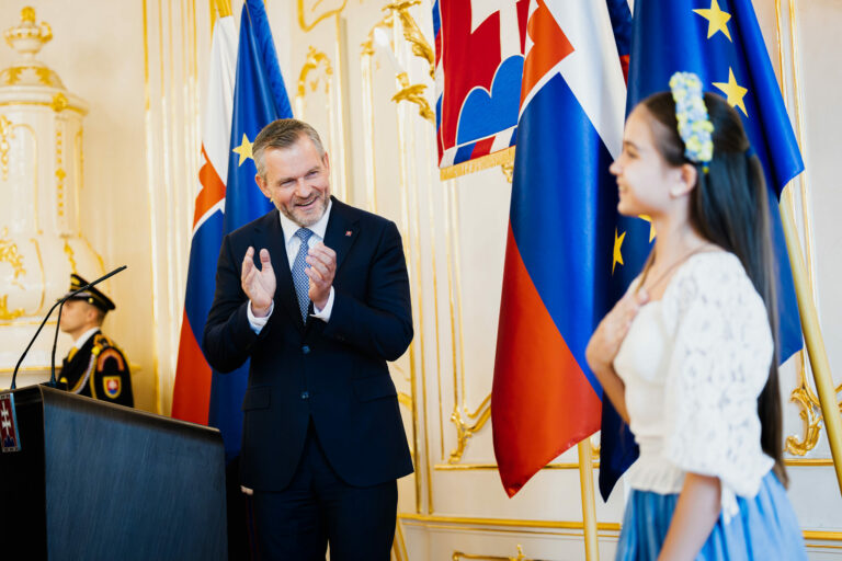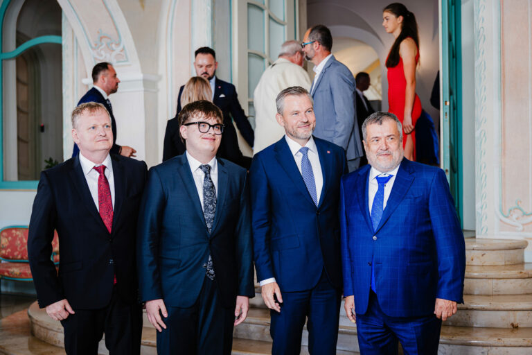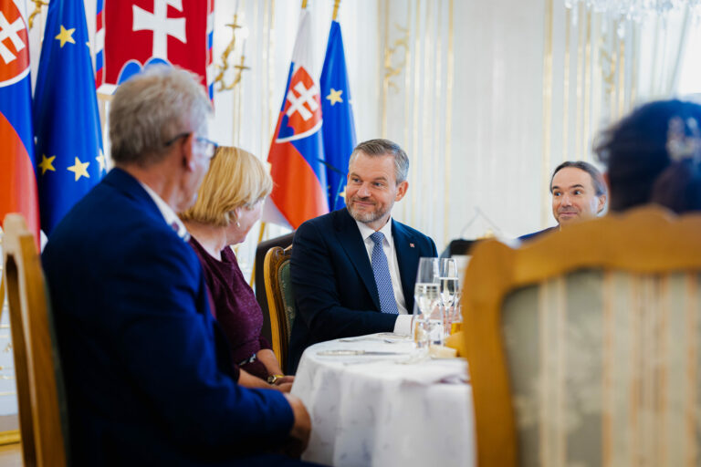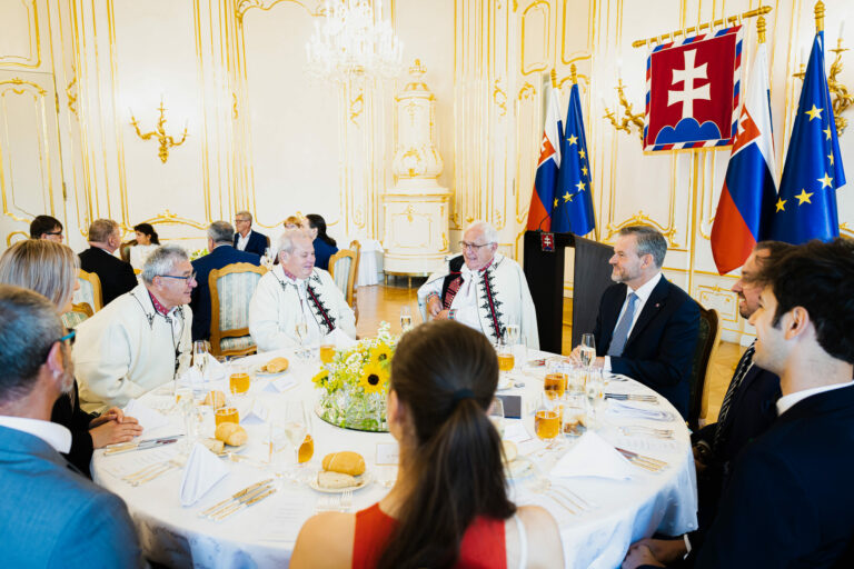 Prezident SR Peter Pellegrini (uprostred) počas slávnostného obeda pri príležitosti prvého výročia inaugurácie v Prezidentskom paláci. Bratislava, 16. jún 2025. Foto: SITA/Kancelária prezidenta
