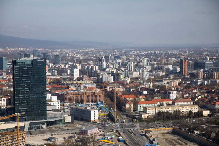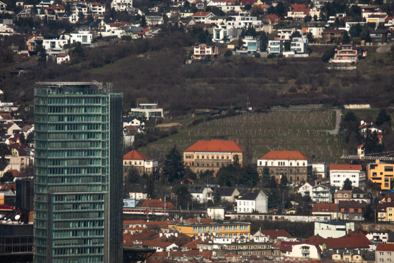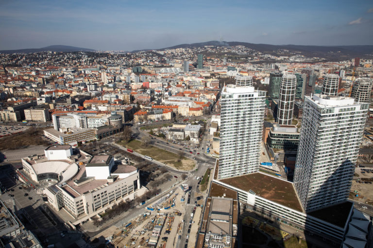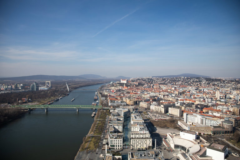 Pohľad na Bratislavu z najvyššieho poschodia prvého slovenského mrakodrapu Eurovea Tower v Bratislave počas novinárskeho dňa, na ktorom informovali o výstavbe a sprístupnení jednotlivých funkcií rozšírenej Eurovea . Bratislava, 10. marec 2023. Foto: SITA/Diana Černáková SITA/Diana Černáková