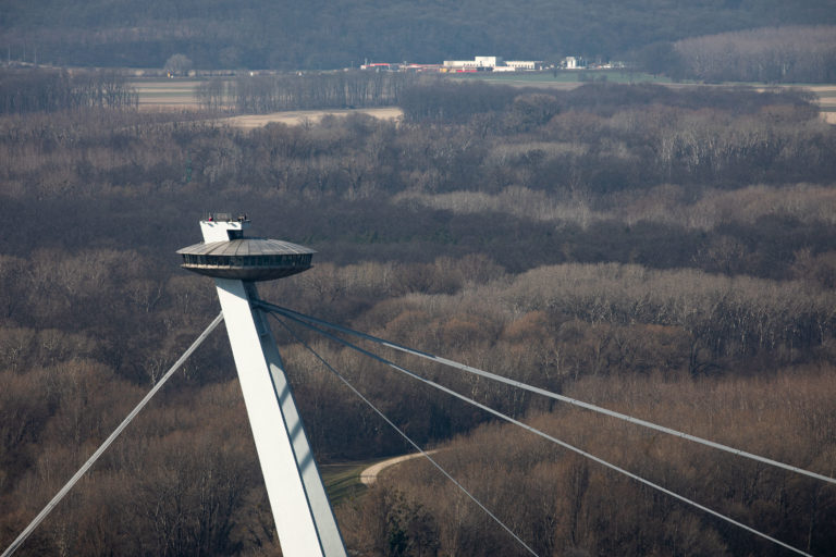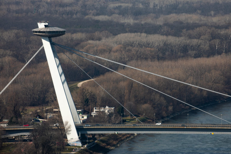 Pohľad na Most SNP z najvyššieho poschodia prvého slovenského mrakodrapu Eurovea Tower v Bratislave počas novinárskeho dňa, na ktorom informovali o výstavbe a sprístupnení jednotlivých funkcií rozšírenej Eurovea . Bratislava, 10. marec 2023. Foto: SITA/Diana Černáková SITA/Diana Černáková