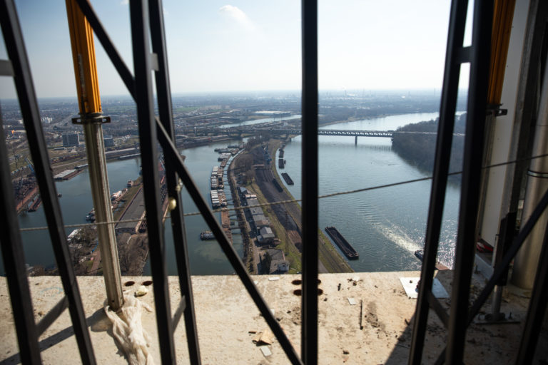 Pohľad na prístav na Dunaji z najvyššieho poschodia prvého slovenského mrakodrapu Eurovea Tower v Bratislave počas novinárskeho dňa, na ktorom informovali o výstavbe a sprístupnení jednotlivých funkcií rozšírenej Eurovea . Bratislava, 10. marec 2023. Foto: SITA/Diana Černáková SITA/Diana Černáková