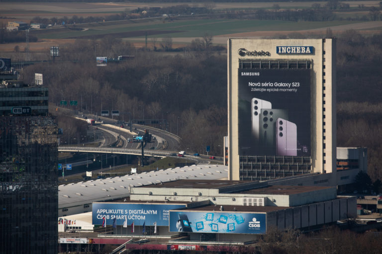 Pohľad na Inchebu z najvyššieho poschodia prvého slovenského mrakodrapu Eurovea Tower v Bratislave počas novinárskeho dňa, na ktorom informovali o výstavbe a sprístupnení jednotlivých funkcií rozšírenej Eurovea . Bratislava, 10. marec 2023. Foto: SITA/Diana Černáková SITA/Diana Černáková