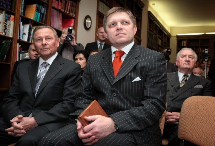 Zľava: Bývalý prezident SR Rudolf Schuster, predseda vlády Robert Fico a bývalý prezident SR Michal Kováč († 86). Foto: SITA/Tomáš Benedikovič