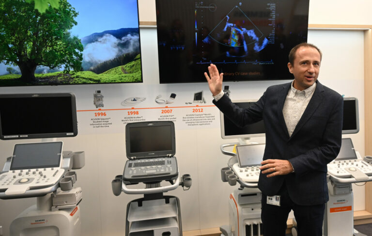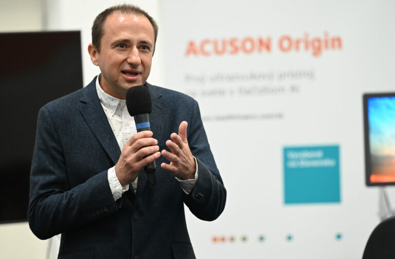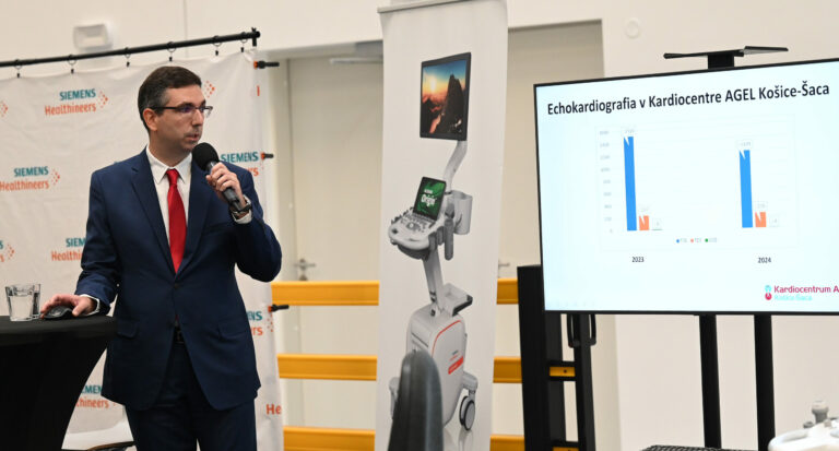 Vedúci divízie Ultrasound Siemens Healthineers Slovensko Miroslav Kliment počas predstavenia prvého ultrazvuku s AI tlačidlom na svete, ktorý je navyše prvým prístrojom vyrobeným v košickom závode. Košice, 23. október 2024. Foto: SITA/Viktor Zamborský