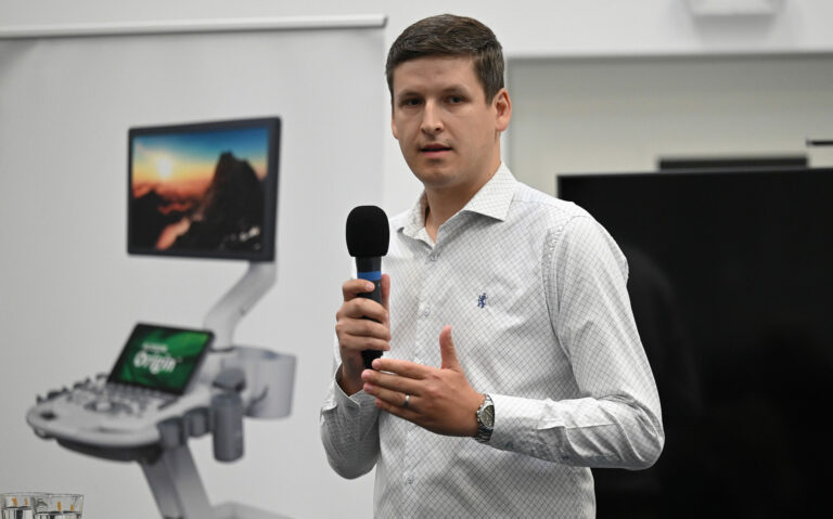 Hlavný lekár Oddelenia neinvazívnej kardiológie Agel kardiocentrum Viktor Vitanov počas predstavenia prvého ultrazvuku s AI tlačidlom na svete, ktorý je navyše prvým prístrojom vyrobeným v košickom závode. Košice, 23. október 2024. Foto: SITA/Viktor Zamborský
