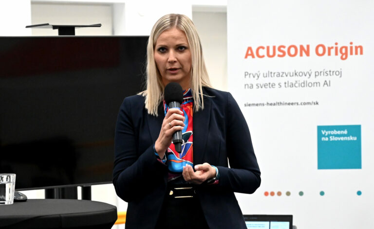 Manažérka závodu Siemens Healthineers Ultrasound Katarína Zidorová počas predstavenia prvého ultrazvuku s AI tlačidlom na svete, ktorý je navyše prvým prístrojom vyrobeným v košickom závode. Košice, 23. október 2024. Foto: SITA/Viktor Zamborský
