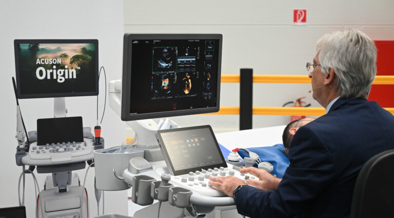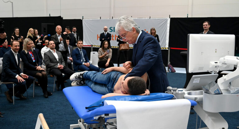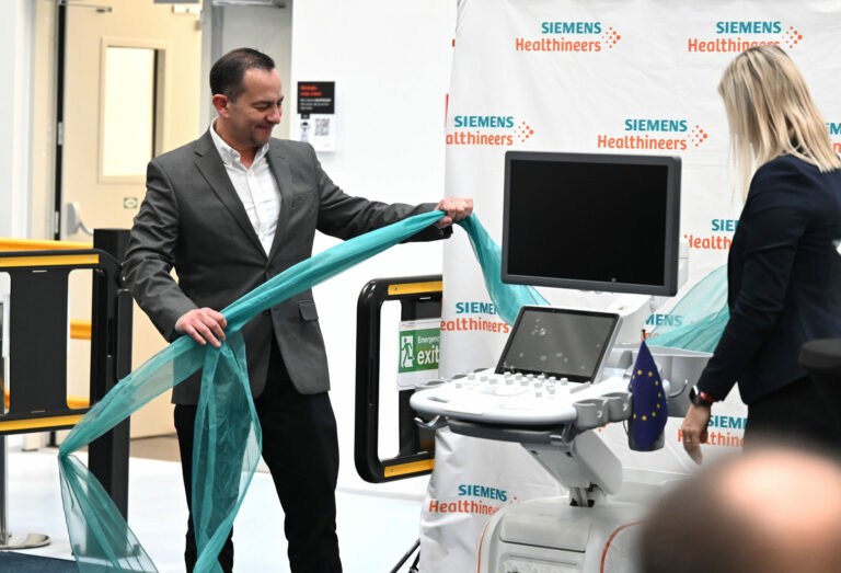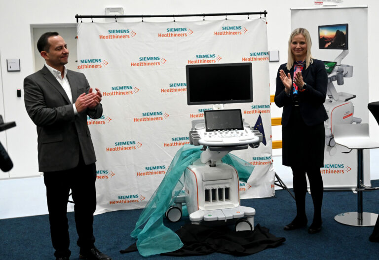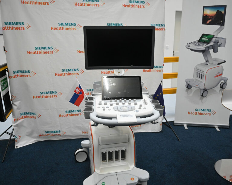 Prvý ultrazvuk s AI tlačidlom na svete, ktorý je navyše prvým prístrojom vyrobeným v košickom závode počas predstavenia v Panattoni Parku Košice Airport. Košice, 23. október 2024. Foto: SITA/Viktor Zamborský