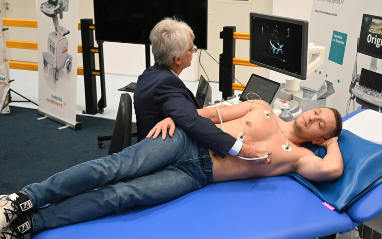 Profesor na Lekárskej fakulte Univerzity Pavla Jozefa Šafárika v Košiciach a prednosta 1. Kliniky kardiológie na Lekárskej fakulte UPJŠ v Košiciach a Východoslovenského ústavu srdcových a cievnych chorôb v Košiciach Gabriel Valočík (vľavo) počas predstavenia prvého ultrazvuku s AI tlačidlom na svete, ktorý je navyše prvým prístrojom vyrobeným v košickom závode. Košice, 23. október 2024. Foto: SITA/Viktor Zamborský