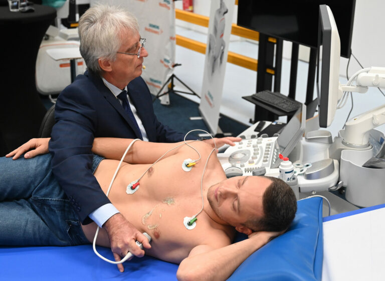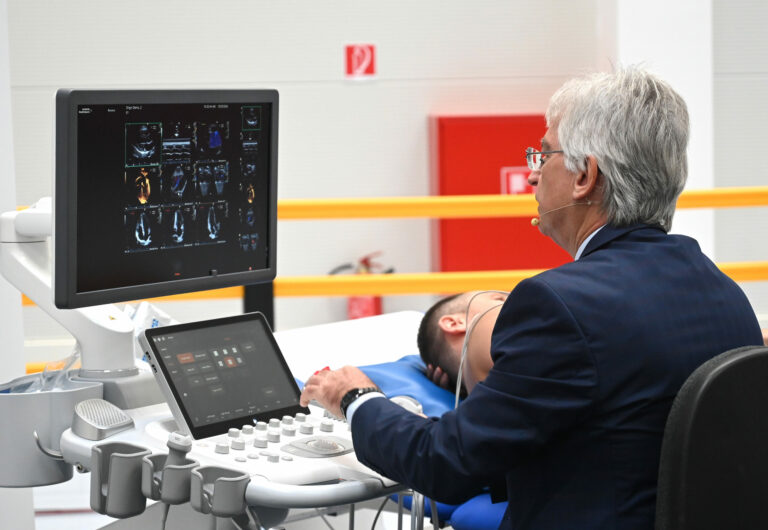 Profesor na Lekárskej fakulte Univerzity Pavla Jozefa Šafárika v Košiciach a prednosta 1. Kliniky kardiológie na Lekárskej fakulte UPJŠ v Košiciach a Východoslovenského ústavu srdcových a cievnych chorôb v Košiciach Gabriel Valočík (vpravo) počas predstavenia prvého ultrazvuku s AI tlačidlom na svete, ktorý je navyše prvým prístrojom vyrobeným v košickom závode. Košice, 23. október 2024. Foto: SITA/Viktor Zamborský