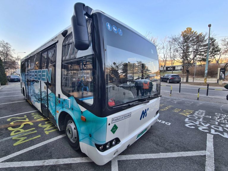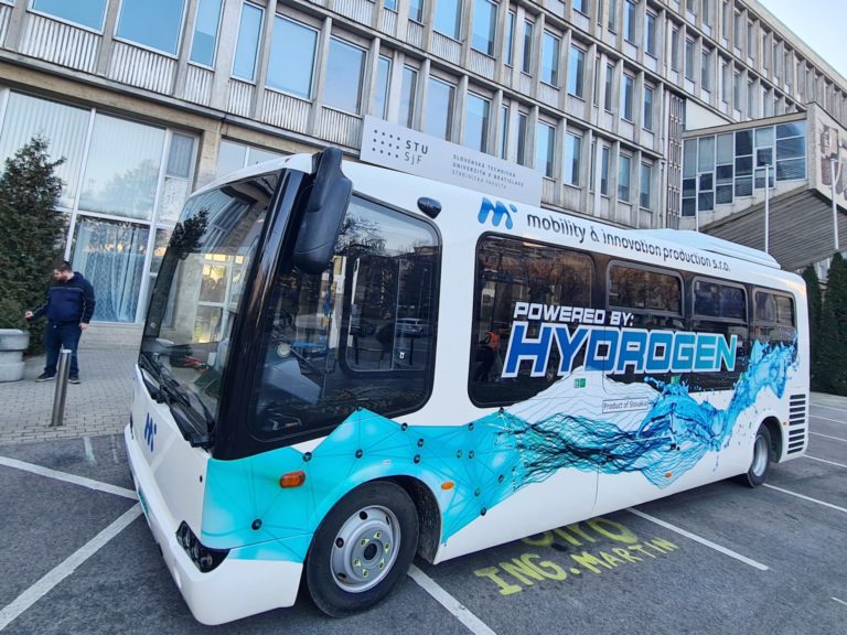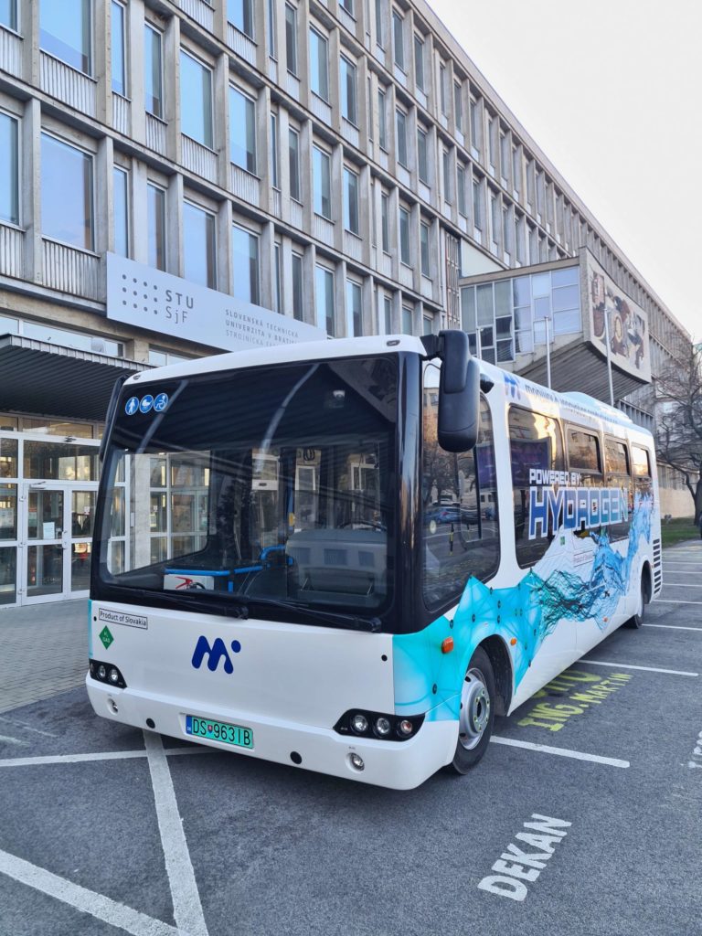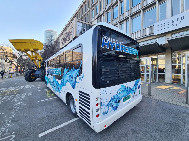 Prvý vodíkový midibus v Európe, ktorý predstavili počas Dňa otvorených dverí Strojníckej fakulty Slovenskej technickej univerzity (SjF STU) v Bratislave. Bratislava, 9. február 2023. Foto: SITA/Ľudovít Vaniher