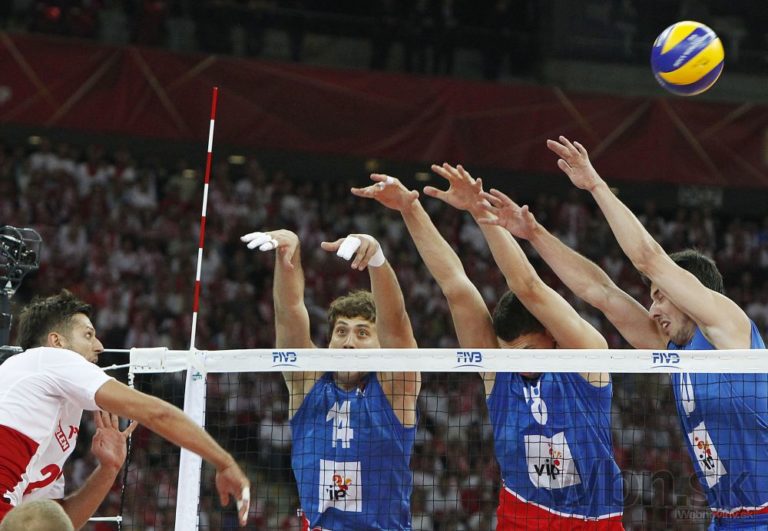 Srbi Aleksander Atanasijevič (druhý zľava), Marko Podrasčanin and Miloš Nikič zablokovali loptu po smeči Poliaka Michala Winiarského počas úvodného zápasu na MS volejbale, ktoré na upravenom futbalovom štadióne vo Varšave sledovalo 62-tisíc divákov. Foto: SITA/AP
