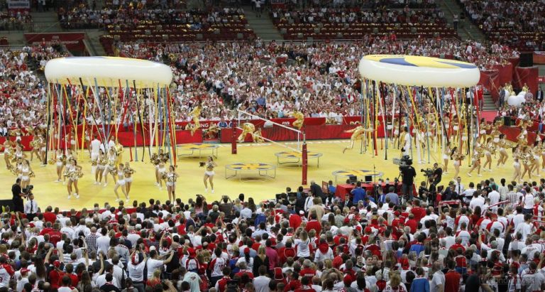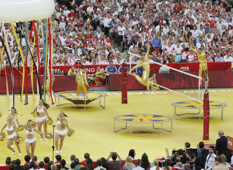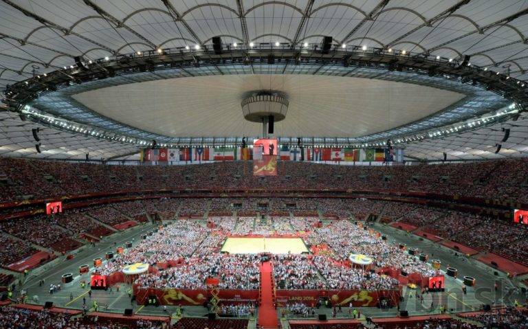 Volejbalisti Poľska zvíťazili v sobotňajšom otváracom zápase XVIII. majstrovstiev sveta práve v tejto krajine nad Srbmi presvedčivo 3:0 (19, 18, 8). Netrpezlivo očakávaný duel sa konal na účelovo upravenom futbalovom Národnom štadióne vo Varšave pred hľadiskom s kapacitou 62 000 divákov. Jedným z rozhodcov bol Slovák Juraj Mokrý. Foto: SITA/AP