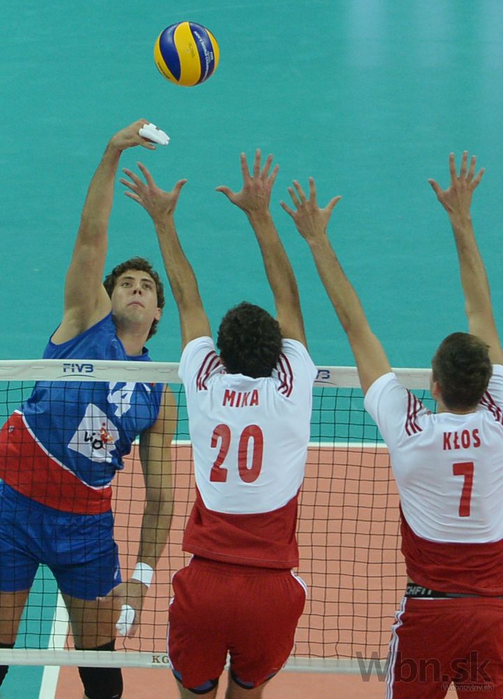 Srb Miloš Nikoč blokujú loptu po smeči Poliaka Mariusza Wlazlyho počas úvodného zápasu na MS volejbale, ktoré na upravenom futbalovom štadióne vo Varšave sledovalo 62-tisíc divákov. Foto: SITA/AP
