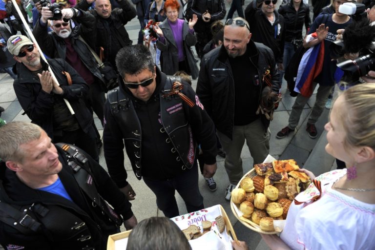 Ruskí motorkári z klubu Noční vlci prichádzajú na Slavín, kde ich dievčatá v krojoch privítali chlebom a soľou. Bratislava, 2. máj 2015. Foto: SITA/Ján Slovák