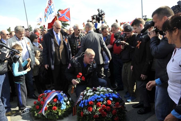 Ruskí motorkári z klubu Noční vlci počas návštevy a kladenia vencov a kvetov k pomníku sovietskych vojakov na bratislavskom Slavíne. Bratislava, 2. máj 2015. Foto: SITA/Ján Slovák