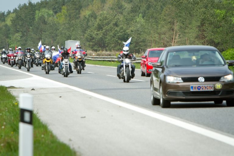 Ruskí motorkári z klubu Noční vlci a motorkári z Česka a Slovenska počas príchodu na Slovensko. Motorkári položia vence a kvety k pomníku sovietskych vojakov na bratislavskom Slavíne. Sekule, 2. máj 2015. Foto: SITA/Ľudovít Vaniher