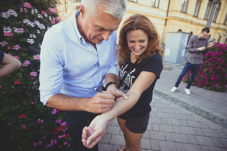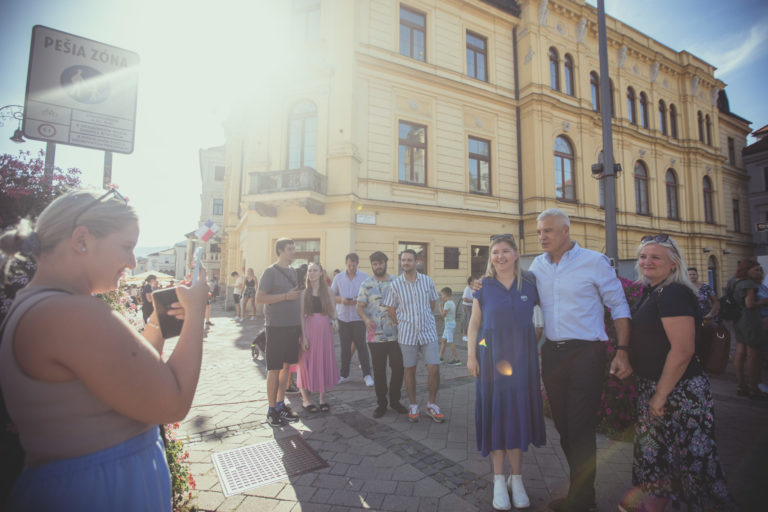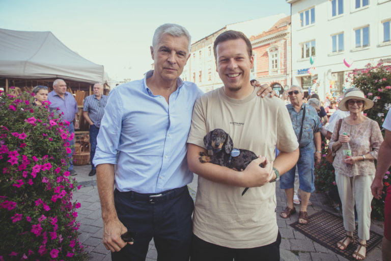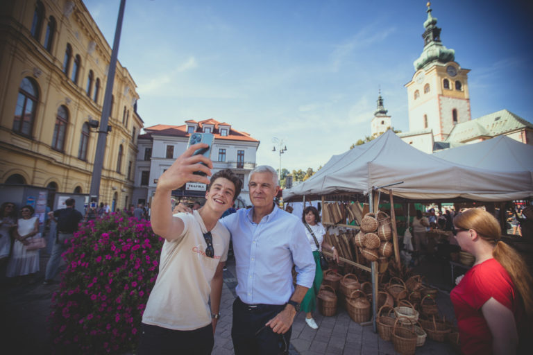 Kandidát na prezidenta SR Ivan Korčok (vľavo) počas zberu podpisov na Radvanskom jarmoku v Banskej Bystrici. Banská Bystrica, 9. september 2023. Foto: SITA/Diana Černak