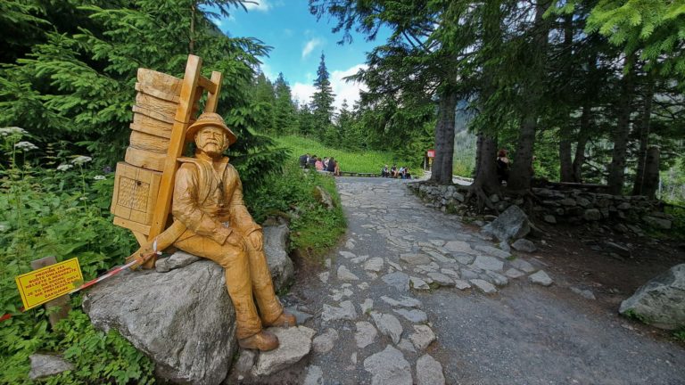 Ikonická socha horského nosiča vyrezávaná z dreva pri Rainerovej chate. Starolesnianska poľana, Vysoké Tatry, 23. augusta 2023. Foto: SITA/Mária Frisová.