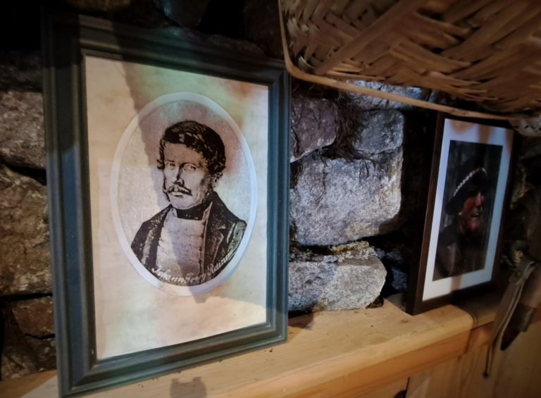 Zobrazenie staviteľa Rainerovej chaty Jána Juraja Rainera vľavo, vpravo foto jej obnoviteľa Petra Petrasa staršieho. Starolesnianska poľana, Vysoké Tatry, 23. augusta 2023. Foto: SITA/Mária Frisová.