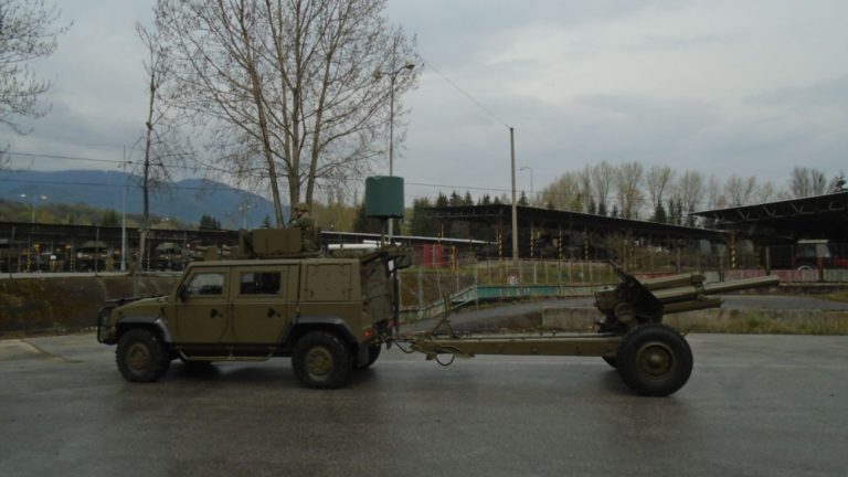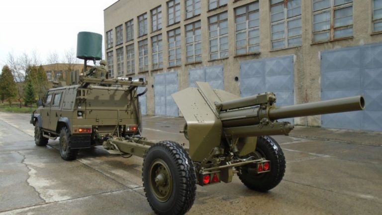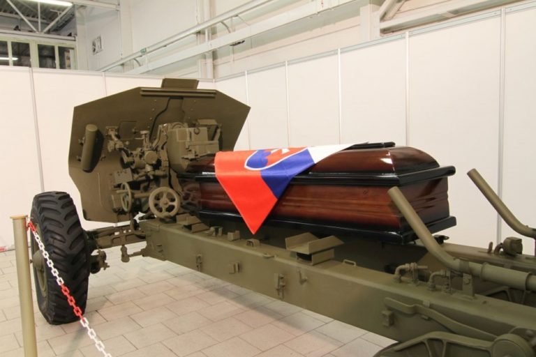 Lafeta delostreleckej húfnice 122 mm vz. 38/74 (vpravo) z fondu Vojenského historického múzea v Piešťanoch, na ktorej budú počas štátneho pohrebu prevezené pozostatky prezidenta Michala Kováča. Húfnicu vyrobili po druhej svetovej vojne v Dubnici nad Váhom. Je upravená na protokolárne účely v súčinnosti s Vojenským historickým ústavom. Počas smútočného sprievodu bude zahalená štátnou vlajkou a bude ju ťahať vojenské vozidlo. Bratislava, 11. október 2016. Foto: SITA/Kancelária prezidenta SR