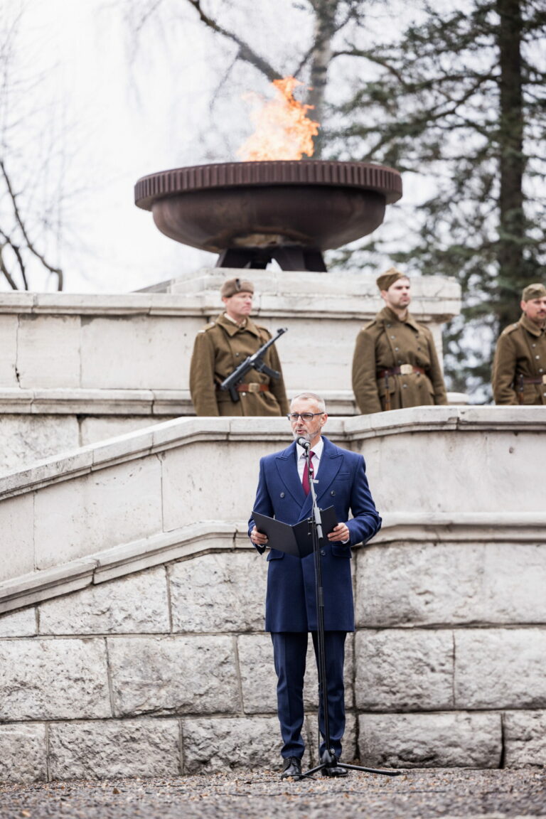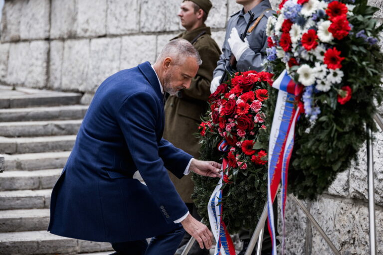 Predseda Národnej rady (NR) SR Richard Raši počas pietnej spomienky na Vojenskom pamätníku a cintoríne Háj Nicovô pri príležitosti 80. výročia oslobodenia mesta Liptovský Mikuláš. Liptovský Mikuláš, 5. apríl 2025. Foto: SITA/Kancelária Národnej rady SR